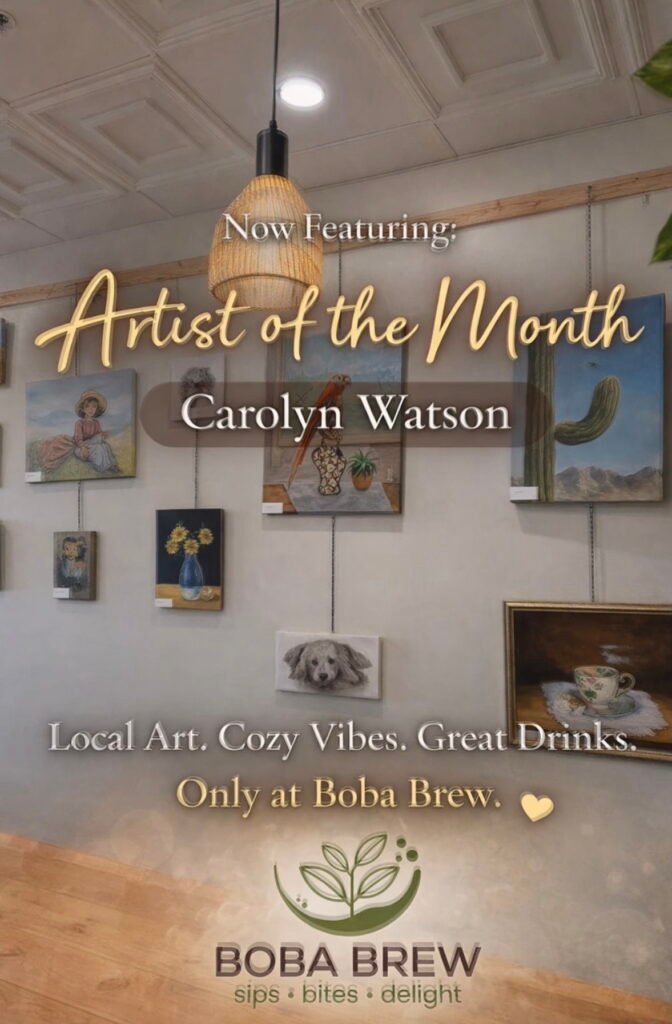 We are so excited to introduce our featured Artist of the Month: Carolyn Watson! Stop by to see Carolyn’s beautiful collection in person—from desert landscapes to charming still lifes, her work brings a wonderful new energy to our walls. Support local talent while you sip on your favorite boba or catch up on some morning coffee.