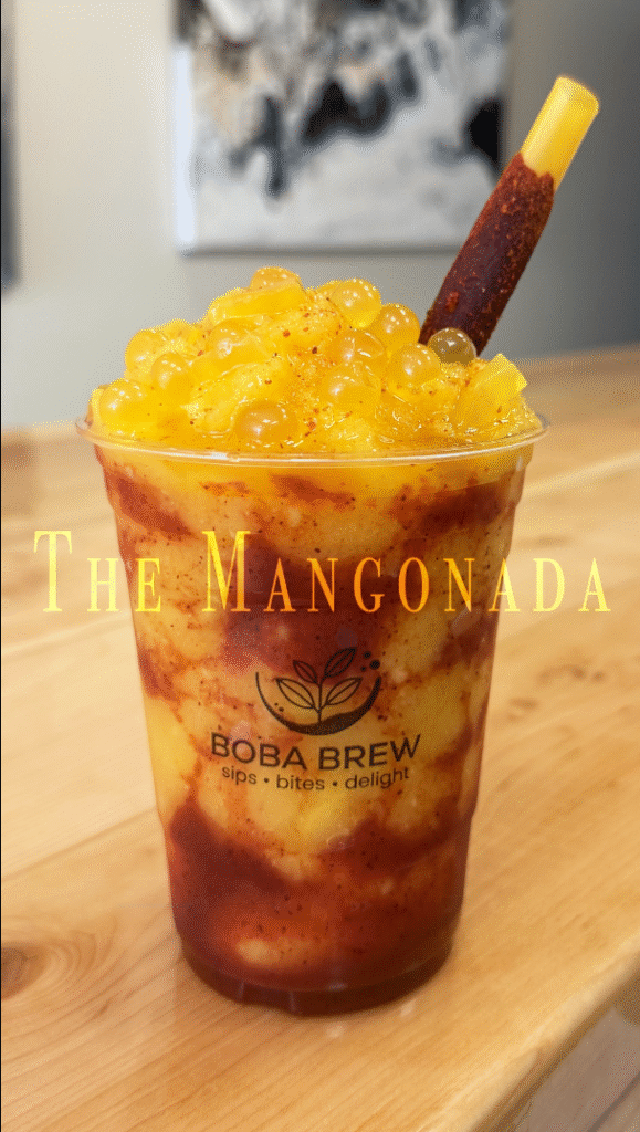 Sweet, tangy, and perfectly refreshing—our Mangonada is a tropical twist you don’t want to miss. Made with ripe mango, a swirl of chamoy, a sprinkle of Tajín, and chewy boba pearls, it’s the ultimate mix of fruity and spicy goodness.